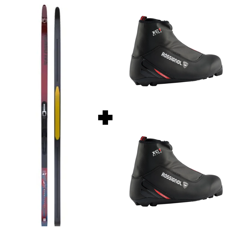 Langrendspakke med Salomon ski, bindinger og Rossignol støvler.